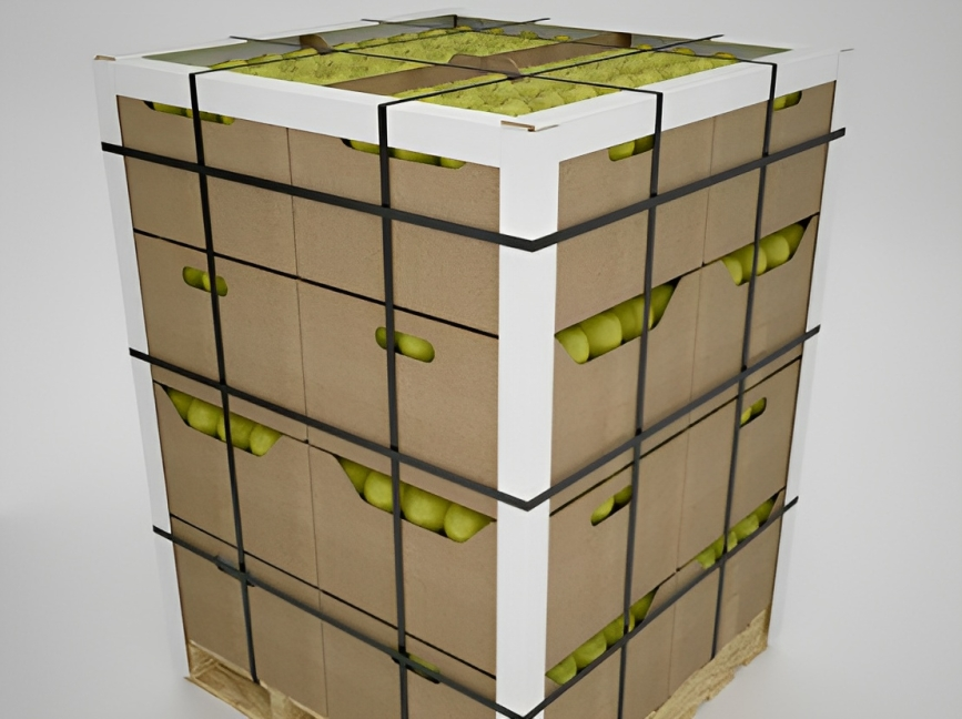 Pour les produits périssables, tels les tomates, pommes de terre, raisins, bananes, le produit ANGLEGUARDTM est utilisé afin de répartir le poids élevé des palettes avec des FEUILLES SÉPARATRICES.